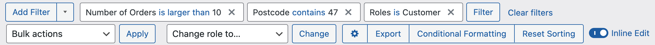 Sorting and filtering: Admin Columns’ smart filtering allows you to easily find what you’re looking for in a big list of products. Add multiple filters at once and segment by any data type, including custom fields. You can also save filter combinations for future use and sort column data with one click.